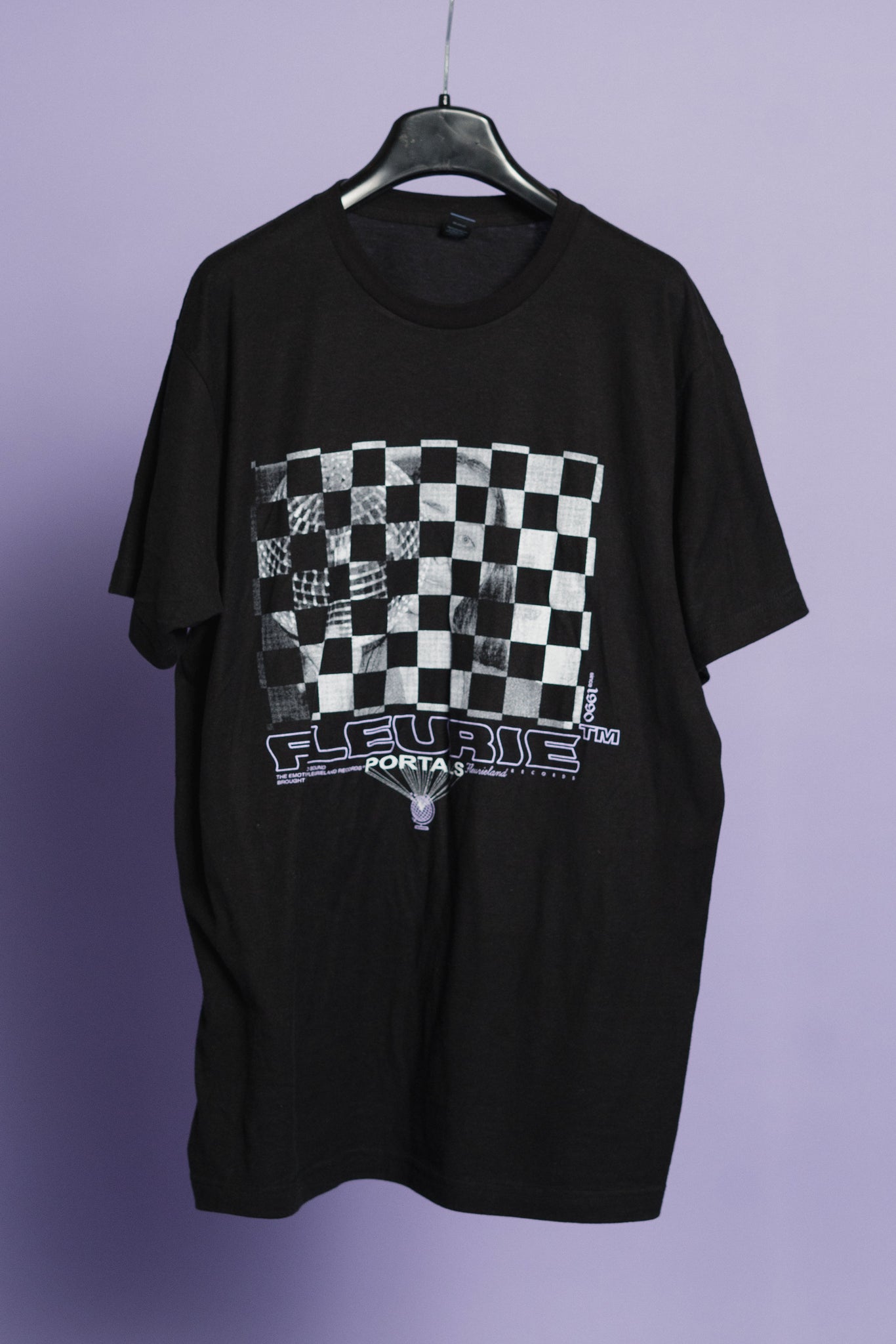 Black T-shirt with checkerboard photo. Unisex sizes S-XXL.