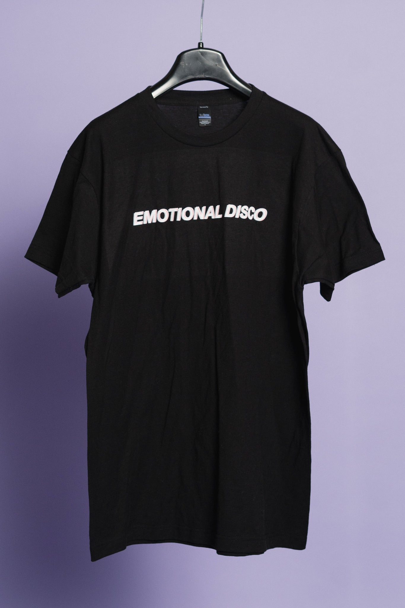 Black T-shirt with light pink text "EMOTIONAL DISCO". Unisex sizes S-XXL.
