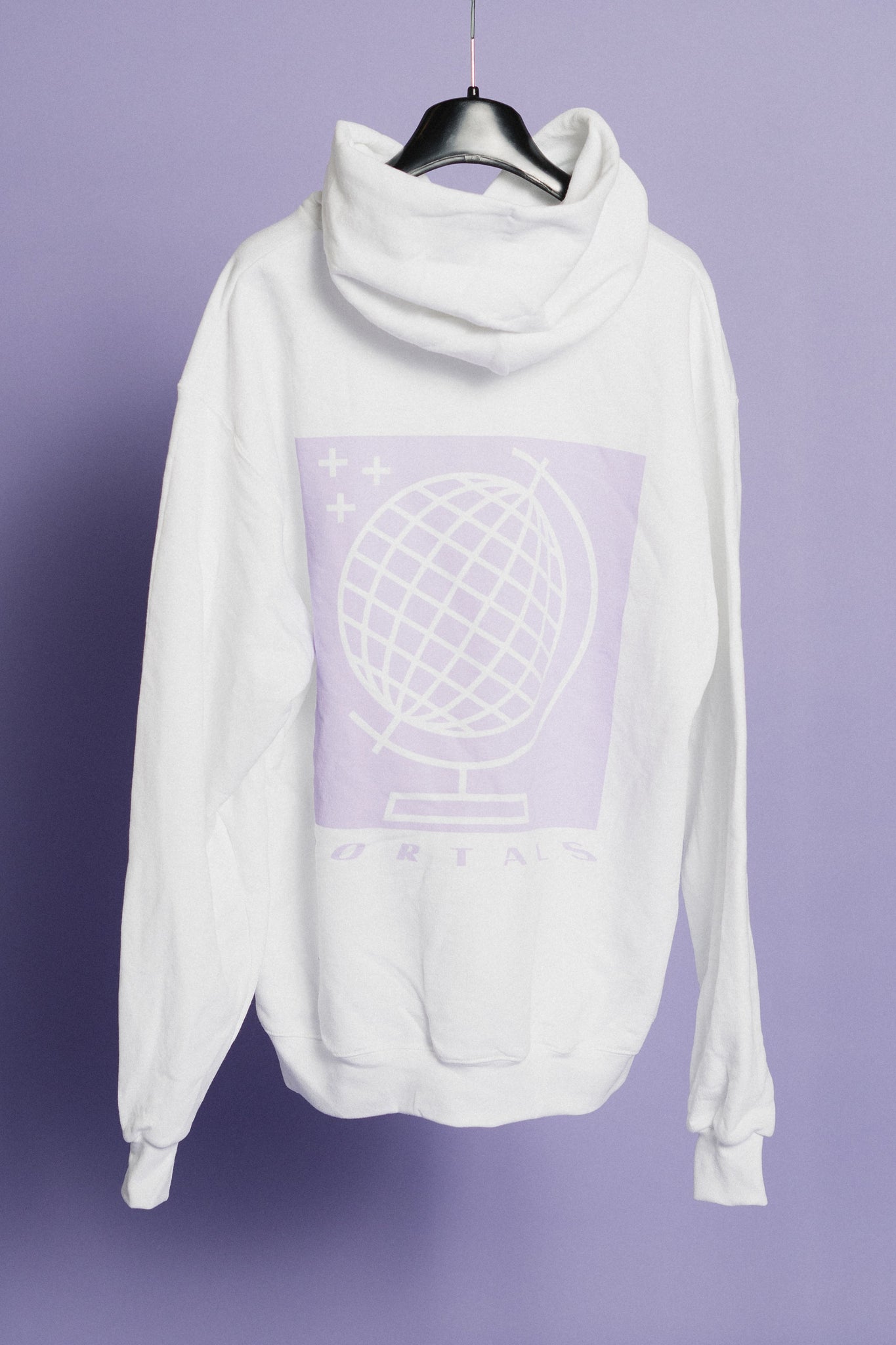 Super soft white Champion hoodie with lavender text (embroidered front "fleurielandTM" and screen printed back with Portals logo). Unisex sizes S-XXL.